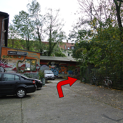 Egal aus welcher Richtung ihr kommt, ihr müsst zum anthrazitfarbenen Haus, auf dem sich zwei große Graffitis befinden (Raum 16 / Sinnträger Tattoos Leipzig). Dort befindet sich (zwischen der Halle 5 und der Frauenkultur) der Eingang zu Sinnträger Tattoos Leipzig.